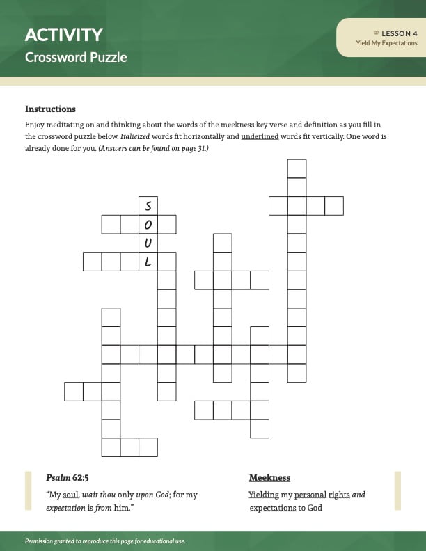 The operational definition of meekness is “yielding my personal rights and expectations to God.” An expectation is a strong assumption that a certain desire will be fulfilled. If an expectation is not met, a person may be disappointed. A right is a privilege or position that is truly yours to claim. Everyone has been given specific rights by their Creator. Sometimes people mistakenly assume something to be a right when it is not. For example, God gives the right to life and to worship Him. However, a person may not be entitled to have comforts or do whatever he wants. Often conflicts occur because people sense that their real or perceived rights are being threatened, and they try to guard them. Trusting God as his Protector and Father, a Christian who exhibits meekness willingly releases any claim to his rights and expectations. He knows God will do what is good. (See Romans 8:28–29.)