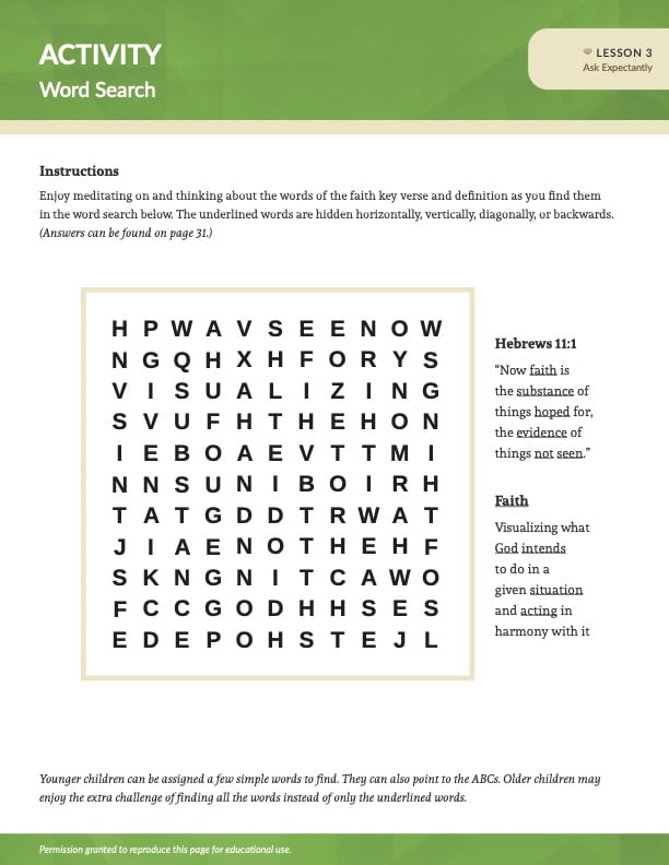 Manualele ilustrate, cu învățături biblice despre caracter, folosesc exemple din viața unor bărbați și femei din Biblie, a căror umblare cu Dumnezeu a dus la un caracter bun sau a căror lipsă de credință a produs un caracter slab. Through this study, children are encouraged to believe God and base their actions on His promises instead of their doubts and fears.