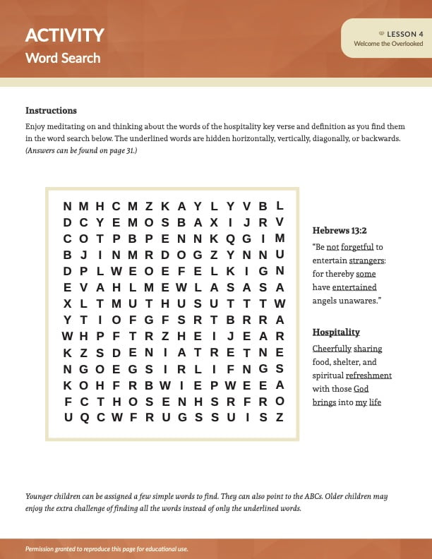 The operational definition of hospitality is “cheerfully sharing food, shelter, and spiritual refreshment with those God brings into my life.” The New Testament word for hospitality means brotherly love to others, including those who were not family. In Bible times, people invited weary travelers to eat and rest in their homes before continuing a journey. Hospitality can still be practiced today! You can befriend others and invite them to a meal, game night, or Bible study. Since the spirit of hospitality is to welcome people into your life wherever you are, your family could invite someone to join your picnic, church event, or outing. Share God’s love without expecting a favor or invitation in return. Do not exclude nonbelievers from your hospitality. Instead, take the opportunity to give them Jesus’ love through your words and actions. You can be kind and respectful to an unbeliever without approving of his sin or false beliefs. Hospitality starts at home by practicing good manners, caring for each other, and working together to prepare for guests.