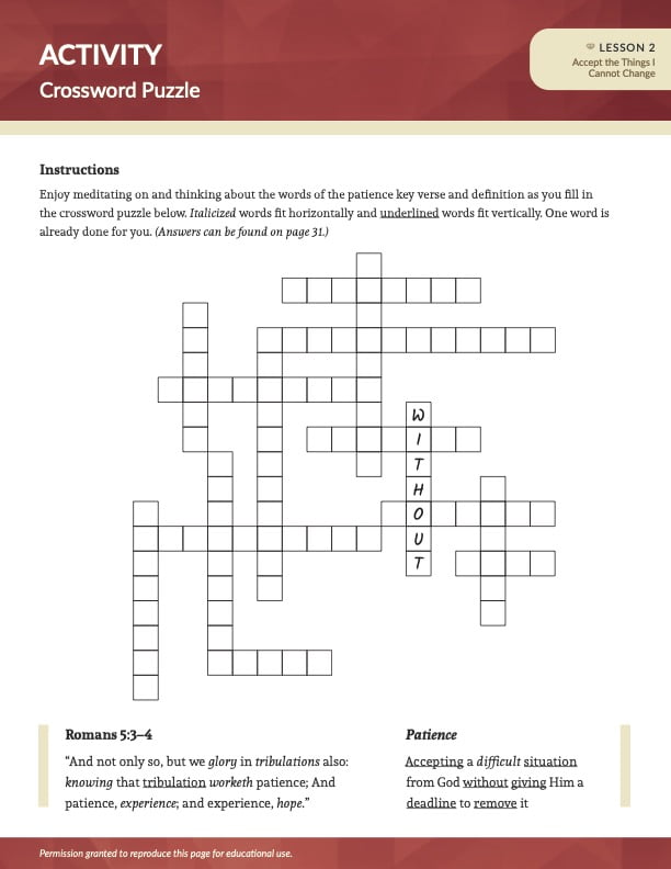 The operational definition of patience is “accepting a difficult situation from God without giving Him a deadline to remove it.” Difficult situations, along with pain and suffering, are consequences of the Fall of man. These include natural disasters such as hurricanes and earthquakes, as well as results of unwise decisions or sinful choices. Some difficulties are brought about by the intentions of evil people who are serving Satan in his opposition to God. When experiencing circumstances that we do not like and cannot control, we must endure patiently. In time, the trial will pass. God encourages our hearts and strengthens our faith through difficult situations. He gives us grace to endure hardships and become more like Jesus as we trust and yield to Him.