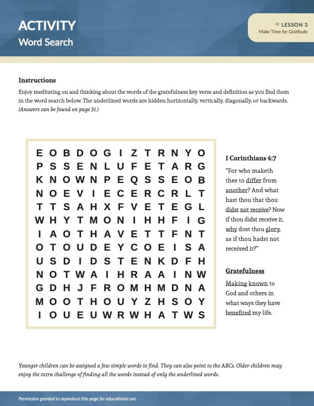 The operational definition of gratefulness is “making known to God and others in what ways they have benefited my life.” What would happen if no one ever taught you how to read instructions, road signs, or the Bible? How long would you live if you never received food? What would you do if no one provided a roof over your head? Even the very breath needed for life is a gift God has given to you! Every day you can find reasons and opportunities to appreciate what God and others do on your behalf. Recognizing these gifts and those individuals who have given them is the first step in developing a grateful attitude. Gratefulness is then complete when you take that extra time and care to demonstrate outwardly through your words or actions how much you inwardly appreciate what they have done for you.