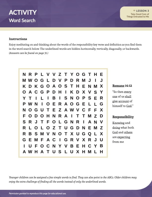 The operational definition of responsibility is “knowing and doing what both God and others are expecting from me.” You can know what God expects from you by reading His Word. As you obey His Word, you will also fulfill your duties toward others, such as loving them, forgiving them, and meeting their practical needs. When an assignment is given to you by your parents, they trust that you will complete it. Once you thoroughly finish the task, you have shown responsibility. You knew what you needed to do and you did it. Sometimes the responsible choice involves sacrifice, such as waiting to play until you have finished your schoolwork or setting aside a planned activity so you can help someone else. However, responsibility reaps the invaluable rewards of a good name, greater privileges, and a clear conscience. (See Proverbs 22:1.)
