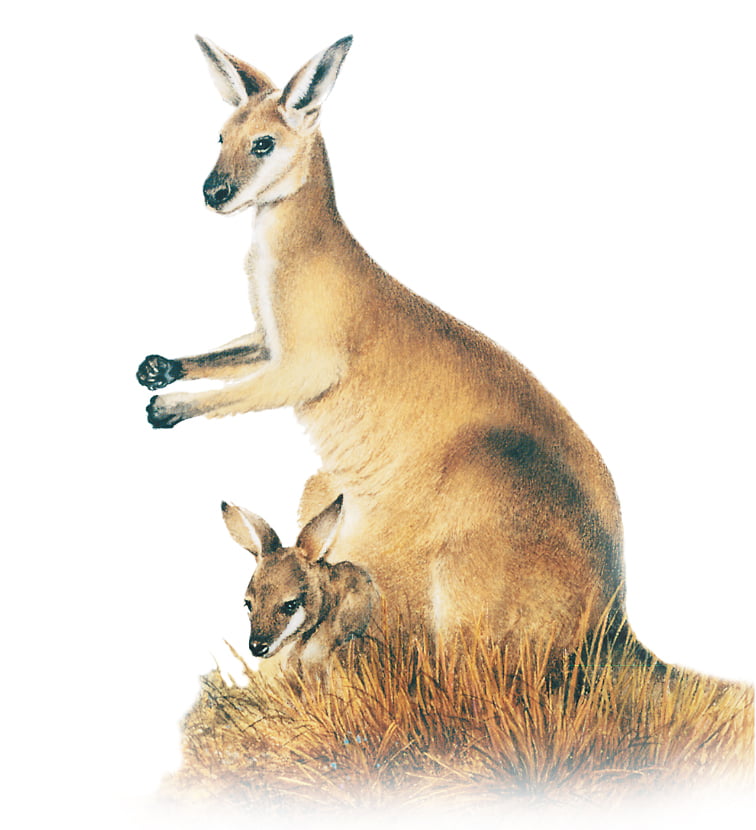 Kangaroos give birth after only a one-month gestation period. The helpless young kangaroo, called a joey, is the size of a lima bean. It finds security in its mother’s pouch, where it receives protection, food, and warmth for up to a year.